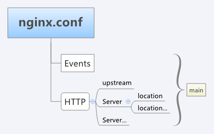 main、server(主机设置)、upstream(负载均衡服务器设置)和 location(URL匹配特定位置的设置)。